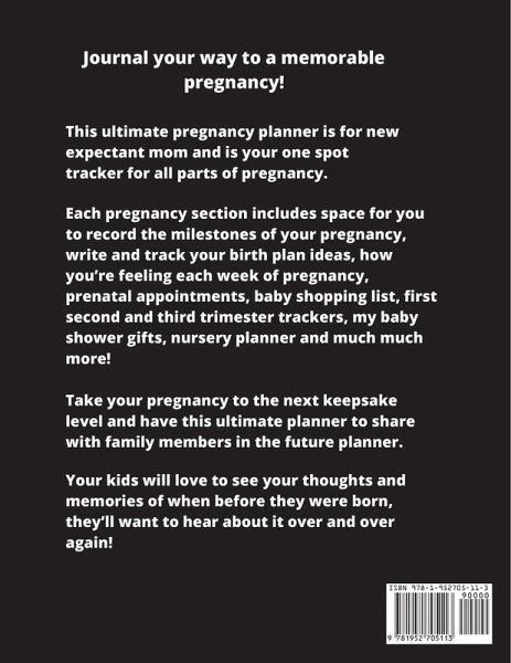This pregnancy journal is a perfect way to capture all your thoughts, feelings & each and every memory while you're on this journey. Each page is guided and has prompts that include: I'm Pregnant - How I found out, my reaction, due date. My Birth Plan Ideas - Type of birth, who I want to take part in the delivery room, what is most important to me. Pregnancy Tracker - 40 weeks tracker of how you're feeling. Appointment Tracker - Date, time address, purpose (doctor, prenatal classes). Baby Shopping List - Checklist of all the baby items you'll need. Weight Tracker - Track your weight weekly. Prenatal Visits Tracker - Blood pressure, weight, baby's heart rate, summary of visit. First, Second & Third Trimester Photos - A place to put your baby bump pics. First, Second & Third Trimester Journal Pages - How you felt, favorite memories & moments, symptoms & cravings, energy, mood, sleep, to do list. My Baby Shower - Place for photos, games played, on the menu, highlights & memories, Place for gifts, name address & thank you sent. Nursery Planner - Color scheme, things to buy, furniture, decorative ideas. Baby Name Ideas - Top 3 favorite girl & boy names & it's meanings, other possibilities. Hospital Checklist - To pack your bag & take with you: for me, for partner, for baby. Pregnancy Shopping List - Baby clothing, supplies, medication, furniture, toys. Fetal Movement Tracker - Daily track your baby's movement. Week By Week Journal Pages - Weekly reflections, what I want to remember most, what I'm most excited about, what I'm most nervous about, baby bump photo to see how much your belly has grown. Week By Week Dear Baby Journal Pages - What I want you to know. Ultrasound Photos - Photo, baby's length (inches long), weight, bpd, due date, notes. This is the most exciting and best experience of your life, whether you're a first time, new mom or this is not your first go around. You will want to write everything down in this notebook to look back on and always remember carrying your little one. Use it every day for writing your experiences. Also makes a great gift for moms. Keeping all your information in one spot has never been so easy. Make your memories last forever. This pregnancy journal will help you keep track of your own personal journey. Size is 8.5x11 inches, 104 pages, soft matte finish cover, white paper, paperback. Get one today