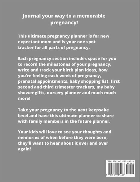This pregnancy journal is a perfect way to capture all your thoughts, feelings & each and every memory while you're on this journey. Each page is guided and has prompts that include: I'm Pregnant - How I found out, my reaction, due date. My Birth Plan Ideas - Type of birth, who I want to take part in the delivery room, what is most important to me. Pregnancy Tracker - 40 weeks tracker of how you're feeling. Appointment Tracker - Date, time address, purpose (doctor, prenatal classes). Baby Shopping List - Checklist of all the baby items you'll need. Weight Tracker - Track your weight weekly. Prenatal Visits Tracker - Blood pressure, weight, baby's heart rate, summary of visit. First, Second & Third Trimester Photos - A place to put your baby bump pics. First, Second & Third Trimester Journal Pages - How you felt, favorite memories & moments, symptoms & cravings, energy, mood, sleep, to do list. My Baby Shower - Place for photos, games played, on the menu, highlights & memories, Place for gifts, name address & thank you sent. Nursery Planner - Color scheme, things to buy, furniture, decorative ideas. Baby Name Ideas - Top 3 favorite girl & boy names & it's meanings, other possibilities. Hospital Checklist - To pack your bag & take with you: for me, for partner, for baby. Pregnancy Shopping List - Baby clothing, supplies, medication, furniture, toys. Fetal Movement Tracker - Daily track your baby's movement. Week By Week Journal Pages - Weekly reflections, what I want to remember most, what I'm most excited about, what I'm most nervous about, baby bump photo to see how much your belly has grown. Week By Week Dear Baby Journal Pages - What I want you to know. Ultrasound Photos - Photo, baby's length (inches long), weight, bpd, due date, notes. This is the most exciting and best experience of your life, whether you're a first time, new mom or this is not your first go around. You will want to write everything down in this notebook to look back on and always remember carrying your little one. Use it every day for writing your experiences. Also makes a great gift for moms. Keeping all your information in one spot has never been so easy. Make your memories last forever. This pregnancy journal will help you keep track of your own personal journey. Size is 8.5x11 inches, 104 pages, soft matte finish cover, white paper, paperback. Get one today