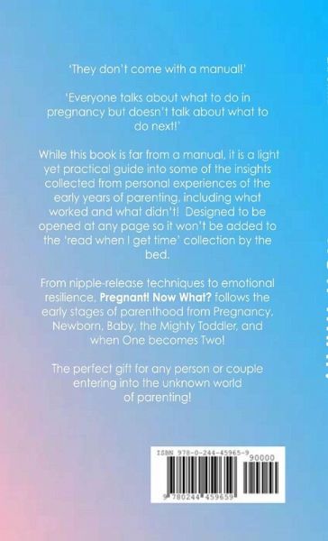 The practical, life-tested handbook for first time parents. 'They don't come with a manual!' Parents have said time and time again. 'Everyone talks about what to do in pregnancy but doesn't talk about what to do next!' While this book is far from a manual, it is a light yet practical guide into some of the insights I have collected from my personal experiences of the early years of parenting, including what worked and what didn't! Designed to be opened at any page so it won't be added to the ever growing 'read when I get time' collection. From nipple-release techniques to emotional resilience, Pregnant! Now What? follows the early stages of parenthood from Pregnancy, Newborn, Baby, the Mighty Toddler, and when one becomes two! The perfect gift for any person or couple entering into the unknown world of parenting!