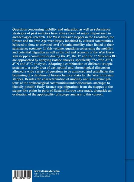 Questions concerning mobility and migration as well as subsistence strategies of past societies have always been of major importance in archaeological research. The West Eurasian steppes in the Eneolithic, the Early Bronze and the Iron Age were largely inhabited by cultural communities believed to show an elevated level of spatial mobility, often linked to their subsistence economy. In this volume, questions concerning the mobility and potential migration as well as the diet and economy of the West Eurasian steppes communities during the 4th, the 3rd and the 1st Millennia BC are approached by applying isotope analysis, specifically 87Sr/86Sr, d18O, d15N and d13C analyses. Adapting a combination of different isotopic systems to a study area of vast spatial and chronological dimension allowed a wide variety of questions to be answered and establishes the beginning of a database of biogeochemical data for the West Eurasian steppes. Besides the characterisation of mobility and subsistence patterns of the archaeological communities under discussion, attempts to identify possible Early Bronze Age migrations from the steppes to the steppe-like plains in parts of Eastern Europe were made, alongside an evaluation of the applicability of isotope analysis to this context.