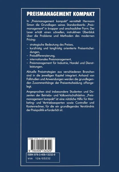 Preise werden oft auf Basis von Fingerspitzengefühl, Faustregeln oder subjektiven Meinungen festgelegt. Mehr Professionalität ist nötig. Der "Preis-Papst" Professor Simon behandelt in diesem bewußt kürzer gehaltenen Lehrbuch das gesamte Spektrum des Preismanagements, z. B. die Ermittlung optimaler Preise sowie die dynamische Preispolitik und Preisdifferenzierung. Das große,handbuchartige Standard- werk "Preismanagement" desselben Autors ermöglicht dem Leser eine umfassende Auseinandersetzung mit dem Preis als zentralem Instrument der optimalen Gewinnausschöpfung.