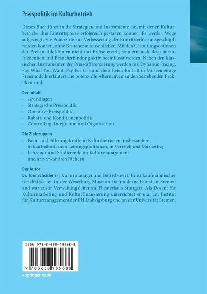 Dieses Buch führt in die Strategien und Instrumente ein, mit denen Kulturbetriebe ihre Eintrittspreise erfolgreich gestalten können. Es werden Wege aufgezeigt, wie Potenziale zur Verbesserung der Eintrittserlöse ausgeschöpft werden können, ohne Besucher auszuschließen. Mit den Gestaltungsoptionen der Preispolitik können nicht nur Erlöse erzielt, sondern auch Besucherzufriedenheit und Besucherbindung aktiv beeinflusst werden. Neben den klassischen Instrumenten der Preisdifferenzierung werden mit Dynamic Pricing, Pay-What-You-Want, Pay-Per-Use und dem freien Eintritt in Museen einige Preismodelle erläutert, die potenzielle Alternativen zu den bestehenden Praktiken sind.