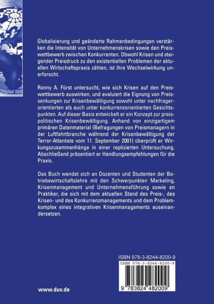 Ronny A. Fürst untersucht, wie sich Krisen auf den Preiswettbewerb auswirken, und evaluiert die Eignung von Preissenkungen zur Krisenbewältigung sowohl unter nachfragerorientierten als auch unter konkurrenzorientierten Gesichtspunkten. Auf dieser Basis entwickelt er ein Konzept zur preispolitischen Krisenbewältigung. Anhand von einzigartigem primären Datenmaterial (Befragungen von Preismanagern in der Luftfahrtbranche während der Krisenbewältigung der Terror-Attentate vom 11. September 2001) überprüft er Wirkungszusammenhänge in einer replizierten Untersuchung. Abschließend präsentiert er Handlungsempfehlungen für die Praxis.