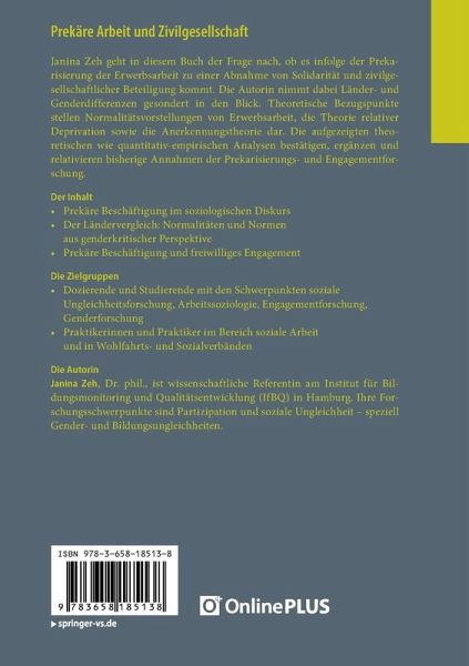 Janina Zeh geht in diesem Buch der Frage nach, ob es infolge der Prekarisierung der Erwerbsarbeit zu einer Abnahme von Solidarität und zivilgesellschaftlicher Beteiligung kommt. Die Autorin nimmt dabei Länder- und Genderdifferenzen gesondert in den Blick. Theoretische Bezugspunkte stellen Normalitätsvorstellungen von Erwerbsarbeit, die Theorie relativer Deprivation sowie die Anerkennungstheorie dar. Die aufgezeigten theoretischen wie quantitativ-empirischen Analysen bestätigen, ergänzen und relativieren bisherige Annahmen der Prekarisierungs- und Engagementforschung.