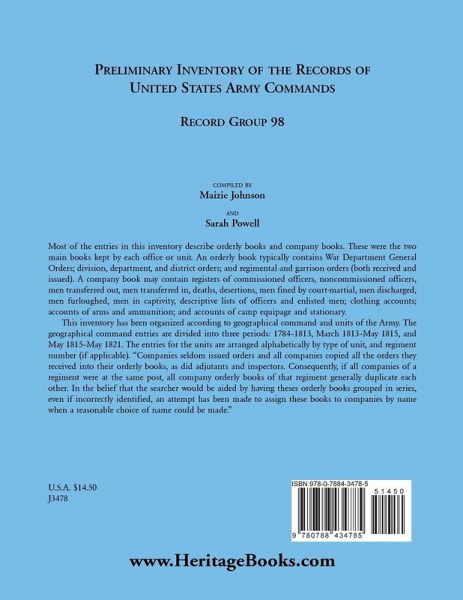 Most of the entries in this inventory describe orderly books and company books. These were the two main books kept by each office or unit. An orderly book typically contains War Department General Orders; division, department, and district orders; and regimental and garrison orders (both received and issued). A company book may contain registers of commissioned officers, noncommissioned officers, men transferred out, men transferred in, deaths, desertions, men fined by court-martial, men discharged, men furloughed, men in captivity, descriptive lists of officers and enlisted men; clothing accounts; accounts of arms and ammunition; and accounts of camp equipage and stationary. This inventory has been organized according to geographical command and units of the Army. The geographical command entries are divided into three periods: 1784-1813, March 1813-May 1815, and May 1815-May 1821. The entries for the units are arranged alphabetically by type of unit, and regiment number (if applicable). "Companies seldom issued orders and all companies copied all the orders they received into their orderly books, as did adjutants and inspectors. Consequently, if all companies of a regiment were at the same post, all company orderly books of that regiment generally duplicate each other. In the belief that the searcher would be aided by having theses orderly books grouped in series, even if incorrectly identified, an attempt has been made to assign these books to companies by name when a reasonable choice of name could be made."