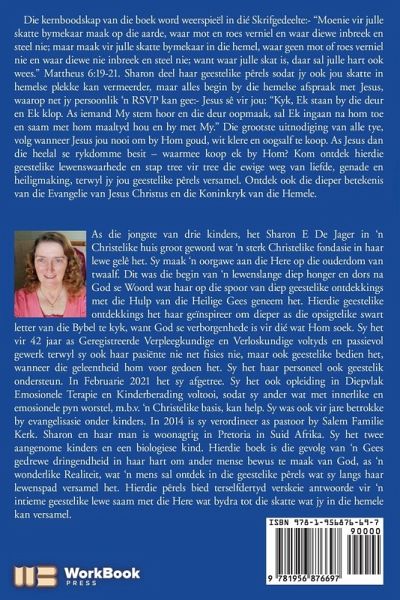Die kernboodskap van die boek word weerspieël in dié Skrifgedeelte:- "Moenie vir julle skatte bymekaar maak op die aarde, waar mot en roes verniel en waar diewe inbreek en steel nie; maar maak vir julle skatte bymekaar in die hemel, waar geen mot of roes verniel nie en waar diewe nie inbreek en steel nie; want waar julle skat is, daar sal julle hart ook wees." Mattheus 6:19-21. Sharon deel haar geestelike pêrels sodat jy ook jou skatte in hemelse plekke kan vermeerder, maar alles begin by die hemelse afspraak met Jesus, waarop net jy persoonlik 'n RSVP kan gee:- Jesus sê vir jou: "Kyk, Ek staan by die deur en Ek klop. As iemand My stem hoor en die deur oopmaak, sal Ek ingaan na hom toe en saam met hom maaltyd hou en hy met My." Die grootste uitnodiging van alle tye, volg wanneer Jesus jou nooi om by Hom goud, wit klere en oogsalf te koop. As Jesus dan die heelal se rykdomme besit - waarmee koop ek by Hom? Kom ontdek hierdie geestelike lewenswaarhede en stap tree vir tree die ewige weg van liefde, genade en heiligmaking, terwyl jy jou geestelike pêrels versamel. Ontdek ook die dieper betekenis van die Evangelie van Jesus Christus en die Koninkryk van die Hemele.