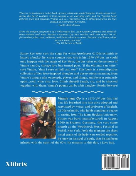 Sunny Key West sets the stage for writer/professor G. J. Dürrschmidt to launch a bucket-list cross-country road trip in his 1970 Volkswagen bus. As only the magic of Key West could possibly make happen, the bus takes on the persona of Vinnie van Go, who decides to try his hand at poetry. "If the old man can write," says Vinnie, "then I sure as hell can too!" This book is a serendipitous collection of Key West-inspired thoughts and observations made through the eyes and poetry of a vintage VW love bus. It's all about love. It reveals the strong and special bond that has grown between man and machine. Both must face the reality of aging and its role as they prepare to hit the road. Come climb aboard. Laugh, cry, and be shocked together with them. Though mostly mild, Vinnie's poems can be somewhat naughty. Reader, beware!