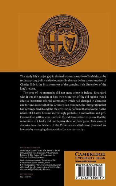 This study fills a major gap in the mainstream narrative of Irish history by reconstructing political developments in the year before the restoration of Charles II. It is the first treatment of the complex Irish dimension of the king's return. The issue of the monarchy did not stand alone in Ireland. Entangled with it was the question of how the restoration of the old regime would affect a Protestant colonial community which had changed in character and fortune as a result of the Cromwellian conquest, the immigration that had accompanied it and the massive transfer of land that followed. As the return of Charles became increasingly probable, Cromwellian and pre-Cromwellian settlers were united in their determination to ensure that the restoration of Charles did not deprive them of their gains. This account discloses how the leaders of the Protestant establishment protected its interests by managing the transition back to monarchy.