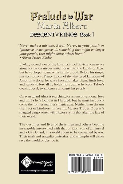 Descent of Kings: Book One "Never make a mistake, Beryl. Never, in your youth or ignorance or arrogance, do something that might endanger your people, that might cause others harm." - Elven Prince Eladar Eladar, second son of the Elven King of Riviera, can never atone for his disastrous initial foray into the Lands of Men, but he yet hopes to make his family proud. Before his simple mission to meet Prince Talon of the shattered kingdom of Amontir is done, he saves lives and takes them, finds love, and stands to lose all he holds most dear as he leads Talon's cousin, Beryl, to sanctuary amongst his people. Caravan guard Alnas is searching for an unconventional love and thinks he's found it in Hardred, but he must first overcome the former mariner's tragic past. Neither man dreams their act of kindness in freeing Master Trader Oberas's snagged cargo vessel will trigger events that alter the fate of their world. The destinies and lives of these men and others become inescapably intertwined with that of Rion, son of a minstrel and a City Guard, in a world about to be consumed by war. Their trials and tragedies, mistakes, and triumphs will either save the world or destroy it.