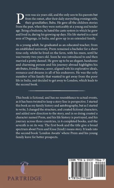 Prem was six years old, and the only son to his parents but from the outset, after their daily storytelling evenings with, their grandfather, Baba. He gave all the children stories from the past, when they were noticeably at a young and tender age. Being a brahmin, he hated the caste system in which he grew and lived in, during his growing up days. His life started in a rural area of Deganga, in India, and grew up in an extended family. As a young adult, he graduated as an educated teacher, from an established university. Prem remained a bachelor for a short time only, whilst he lived on the farm, with his mum, until he was twenty-two years old. Soon he was introduced to and then married a pretty damsel. He grew up to be an elegant, handsome and charming person and his journey abroad highlights his attributes, friendliness, career, aligned with his explorative ideals, romance and dreams in all of his endeavors. He was the only member of his family that wanted to get away from the poor life in India, and decided to get away to London, which leads to the second book.