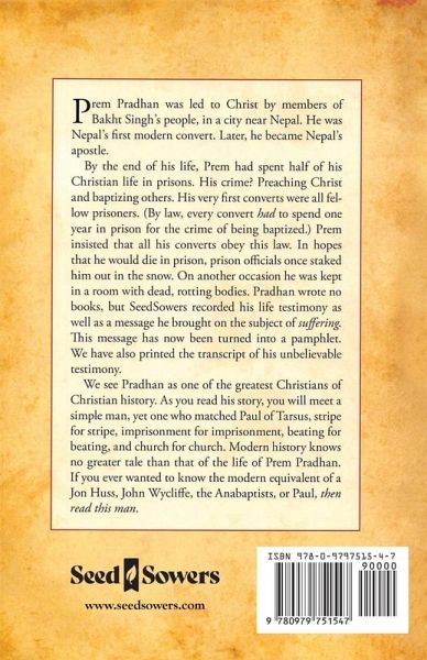 Prem Pradhan was led to Christ by members of Bakht Singh's people, in a city near Nepal. He was Nepal's first modern convert. Later, he became Nepal's apostle. By the end of his life, Prem had spent half of his Christian life in prisons. His crime? Preaching Christ and baptizing others. His very first converts were all fellow prisoners. (By law, every convert had to spend one year in prison for the crime of being baptized.) Prem insisted that all his converts obey the law. In hopes that he would die in prison, prison officials once staked him out in the snow. On another occasion, he was kept in a room with dead, rotting bodies. Pradhan wrote no books, but SeedSowers recorded his life testimony as well as a message he brought on the subject of suffering. This message has now been turned into a pamphlet. We have also printed the transcript of his unbelievable testimony. We see Pradhan as one of the greatest Christians of Christian History. As you read his story, you will meet a simple man, yet one who matched Paul of Tarsus, stripe for stripe, imprisonment for imprisonment, beating for beating, and church for church. Modern history knows no greater tale than that of the life of Prem Pradhan. If you ever wanted to know the modern equivalent of a John Huss, John Wycliffe, the Anabaptists, or Paul, then read this man.