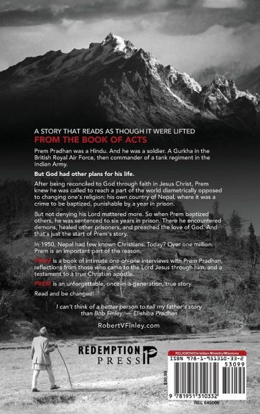 A STORY THAT READS AS THOUGH IT WERE LIFTED FROM THE BOOK OF ACTS Prem Pradhan was a Hindu. And he was a soldier. A Gurkha in the British Royal Air Force, then commander of a tank regiment in the Indian army. But God had other plans for his life. After being reconciled to God through faith in Jesus Christ, Prem knew he was called to reach a part of the world diametrically opposed to changing one's religion: his own country of Nepal, where it was a crime to be baptized, punishable by a year in prison. But not denying his Lord mattered more. So when Prem baptized others, he was sentenced to six years in prison. There he encountered demons, healed other prisoners, and preached the love of God. And that's just the start of Prem's story. In 1950, Nepal had few known Christians. Today? Over one million. Prem is an important part of the reason. PREM is a book of intimate one-on-one interviews with Prem Pradhan, reflections from those who came to the Lord Jesus through him, and a testament to a true Christian apostle. PREM is an unforgettable, once-in-a-generation true story. Read and be changed! I can't think of a better person to tell my father's story than Bob Finley. -Elishiba Pradhan