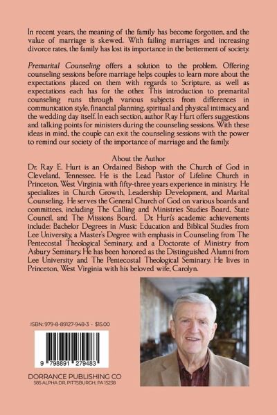 In recent years, the meaning of the family has become forgotten, and the value of marriage is skewed. With failing marriages and increasing divorce rates, the family has lost its importance in the betterment of society. Premarital Counseling offers a solution to the problem. Offering counseling sessions before marriage helps couples to learn more about the expectations placed on them with regards to Scripture, as well as expectations each has for the other. This introduction to premarital counseling runs through various subjects from differences in communication style, financial planning, spiritual and physical intimacy, and the wedding day itself. In each section, author Ray Hurt offers suggestions and talking points for ministers during the counseling sessions. With these ideas in mind, the couple can exit the counseling sessions with the power to remind our society of the importance of marriage and the family. About the Author Dr. Ray E. Hurt is an Ordained Bishop with the Church of God in Cleveland, Tennessee. He is the Lead Pastor of Lifeline Church in Princeton, West Virginia with fifty-three years experience in ministry. He specializes in Church Growth, Leadership Development, and Marital Counseling. He serves the General Church of God on various boards and committees, including The Calling and Ministries Studies Board, State Council, and The Missions Board. Dr. Hurt's academic achievements include: Bachelor Degrees in Music Education and Biblical Studies from Lee University, a Master's Degree with emphasis in Counseling from The Pentecostal Theological Seminary, and a Doctorate of Ministry from Asbury Seminary. He has been honored as the Distinguished Alumni from Lee University and The Pentecostal Theological Seminary. He lives in Princeton, West Virginia with his beloved wife, Carolyn.