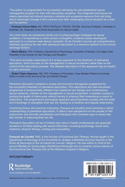 Premature Ejaculation presents a unique and innovative therapeutic program for the successful treatment of premature ejaculation. This descriptive and well-structured program is fundamentally different from traditional sex therapy and contemporary sexual medicine. Centred on the management of sexual excitement, it enables couples to prolong the length of intercourse without having to interrupt their lovemaking or resort to medication. The program's sexological approach also empowers couples with the skills and knowledge to strengthen their sex life leading to a healthier and happier relationship. Combining theory and practical instruction, François de Carufel's book promotes a better understanding of premature ejaculation. It offers a new perspective on the causes of this dysfunction and provides practitioners and therapists with concrete ways to assist men and women in improving their sex life. Premature Ejaculation will be of interest and value to health professionals and graduate students in all fields dealing with sexual difficulties, including psychology, social work, medicine, physical therapy, nursing and counselling.