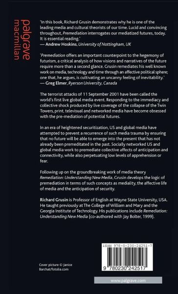 'In this book, Richard Grusin demonstrates why he is one of the leading media and cultural theorists of our time. Lucid and convincing throughout, Premediation interrogates our mediatized futures, today. It is essential reading.'