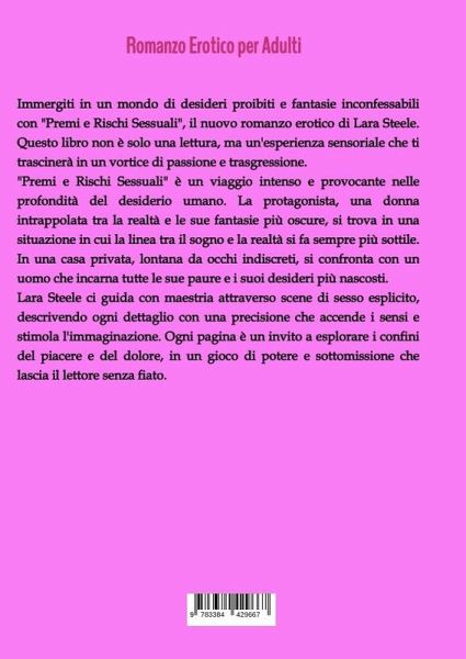Immergiti in un mondo di desideri proibiti e fantasie inconfessabili con "Premi e Rischi Sessuali", il nuovo romanzo erotico di Lara Steele. Questo libro non è solo una lettura, ma un'esperienza sensoriale che ti trascinerà in un vortice di passione e trasgressione."Premi e Rischi Sessuali" è un viaggio intenso e provocante nelle profondità del desiderio umano. La protagonista, una donna intrappolata tra la realtà e le sue fantasie più oscure, si trova in una situazione in cui la linea tra il sogno e la realtà si fa sempre più sottile. In una casa privata, lontana da occhi indiscreti, si confronta con un uomo che incarna tutte le sue paure e i suoi desideri più nascosti.Lara Steele ci guida con maestria attraverso scene di sesso esplicito, descrivendo ogni dettaglio con una precisione che accende i sensi e stimola l'immaginazione. Ogni pagina è un invito a esplorare i confini del piacere e del dolore, in un gioco di potere e sottomissione che lascia il lettore senza fiato.