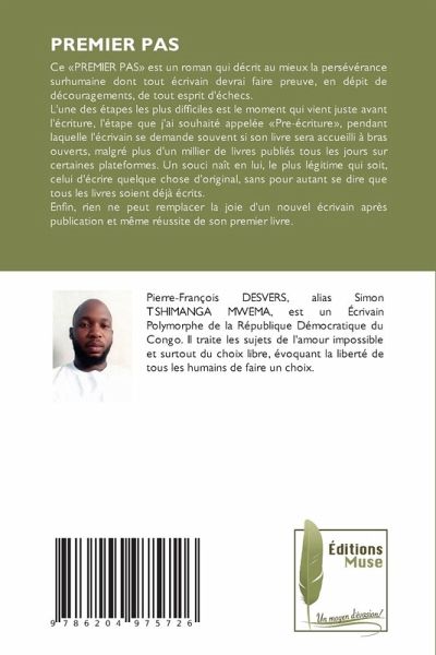 Ce «PREMIER PAS» est un roman qui décrit au mieux la persévérance surhumaine dont tout écrivain devrai faire preuve, en dépit de découragements, de tout esprit d'échecs.L'une des étapes les plus difficiles est le moment qui vient juste avant l'écriture, l'étape que j'ai souhaité appelée «Pre-écriture», pendant laquelle l'écrivain se demande souvent si son livre sera accueilli à bras ouverts, malgré plus d'un millier de livres publiés tous les jours sur certaines plateformes. Un souci naît en lui, le plus légitime qui soit, celui d'écrire quelque chose d'original, sans pour autant se dire que tous les livres soient déjà écrits.Enfin, rien ne peut remplacer la joie d'un nouvel écrivain après publication et même réussite de son premier livre.