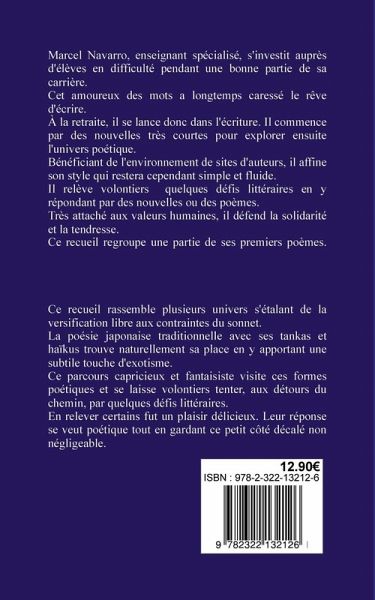 Ce recueil rassemble plusieurs univers allant de la versification libre aux contraintes du sonnet.La poésie japonaise traditionnelle avec ses tankas et haïkus trouve naturellement sa place en y apportant une subtile touche d'exotisme.Ce parcours capricieux et fantaisiste visite ces formes poétiques et se laisse volontiers tenter, aux détours du chemin, par quelques défis littéraires.En relever certains fut un plaisir délicieux. Leur réponse se veut poétique tout en gardant ce petit côté décalé non négligeable.
