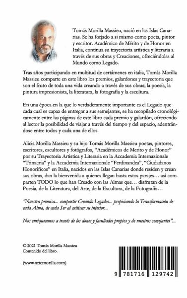 Tras años participando en multitud de certámenes en Italia, Tomás Morilla Massieu comparte en este libro los premios, galardones y trayectoria que son el fruto de toda una vida creando a través de sus obras; la poesía, la pintura impresionista, la literatura, la fotografía y la escultura. En una época en la que lo verdaderamente importante es el Legado que cada cual es capaz de entregar a sus semejantes, se ha recopilado cronológicamente entre las páginas de este libro cada premio y galardón, ofreciendo al lector la posibilidad de viajar a través del tiempo y del espacio, adentrándose entre todos y cada una de ellos. Alicia Morilla Massieu y su hijo Tomás Morilla Massieu poetas, pintores, escritores, escultores y fotógrafos, "Académicos de Merito y de Honor" por su Trayectoria Artistica y Literaria en la Accademia Internazionale "Trinacria" y la Accademia Internazionale "Ferdinandea", "Ciudadanos Honoríficos" en Italia, nacidos en las Islas Canarias donde residen y crean sus obras, dan la bienvenida a quienes llegan hasta estos parajes... así comparten TODO lo que han Creado con las Almas que... disfrutan de la Poesía, de la Literatura, del Arte, de la Escultura, de la Fotografía... "Nuestra premisa... compartir Creando Legados... propiciando la Transformación de cada Alma, de cada Ser al cultivar su interior... Nos enriquecemos a través de los dones y facultades propios y de nuestros semejantes"... Pagina Web Oficial www.artemorilla.com