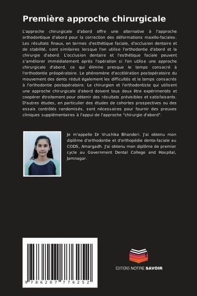 L'approche chirurgicale d'abord offre une alternative à l'approche orthodontique d'abord pour la correction des déformations maxillo-faciales. Les résultats finaux, en termes d'esthétique faciale, d'occlusion dentaire et de stabilité, sont similaires lorsque l'on utilise l'orthodontie d'abord et la chirurgie d'abord. L'occlusion dentaire et l'esthétique faciale peuvent s'améliorer immédiatement après l'opération si l'on utilise une approche chirurgicale d'abord, ce qui élimine presque le temps consacré à l'orthodontie préopératoire. Le phénomène d'accélération postopératoire du mouvement des dents réduit également les difficultés et le temps consacrés à l'orthodontie postopératoire. Le chirurgien et l'orthodontiste qui utilisent une approche chirurgicale d'abord doivent tous deux être expérimentés et coopérer étroitement pour obtenir des résultats prévisibles et satisfaisants. D'autres études, en particulier des études de cohortes prospectives ou des essais contrôlés randomisés, sont nécessaires pour fournir des preuves cliniques supplémentaires à l'appui de l'approche "chirurgie d'abord".