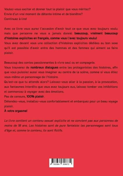 Voulez-vous exciter et donner tout le plaisir que vous méritez?Envie d'un vrai moment de détente intime et de bienêtre?Continuez à lire!Avec ce livre vous aurez l'occasion d'avoir tout ce que vous avez toujours voulu mais que personne ne vous a jamais donné: beaucoup, vraiment beaucoup d'histoires explicites en français, comme vous l'avez toujours voulu!Vous avez devant vous une collection d'histoires explicites dédiées au bon sexe qu'il est possible d'avoir entre des hommes et des femmes qui aiment se faire plaisir. Beaucoup des contes passionnantes à vivre seul ou en compagnie.Vous trouverez de nombreux dialogues entre les protagonistes des histoires, afin que vous puissiez aussi vous imaginer au centre de la scène, comme si vous étiez vous-même un personnage de l'histoire.Qu'est-ce que tu attends alors? Laissez-vous aller à la passion, à la provocation, aux fantasmes interdits que vous avez toujours eus, laissez tomber vos inhibitions et commencez à voyager avec des émotions.Pas de censure, 100 pour 100 de plaisir.Détendez-vous, installez-vous confortablement et embarquez pour un beau voyage plaisir.À votre orgasme!