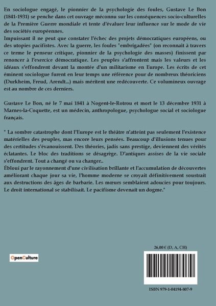 En sociologue engagé, le pionnier de la psychologie des foules, Gustave Le Bon (1841-1931) se penche dans cet ouvrage méconnu sur les conséquences socio-culturelles de la Première Guerre mondiale et tente d'évaluer leur influence sur le mode de vie des sociétés européennes. Impuissant il ne peut que constater l'échec des projets démocratiques européens, ou des utopies pacifistes. Avec la guerre, les foules "embrigadées" (on reconnaît à travers ce terme le penseur critique, pionnier de la psychologie des masses) finissent par renoncer à l'exercice démocratique. Les peuples s'affrontent mais les valeurs et les idéaux s'effondrent devant la montée d'un militarisme en Europe. Les écrits de cet éminent sociologue furent en leur temps une référence pour de nombreux théoriciens (Durkheim, Freud, Arendt...) mais méritent une redécouverte. Ce volumineux ouvrage est au nombre de ces derniers. Gustave Le Bon, né le 7 mai 1841 à Nogent-le-Rotrou et mort le 13 décembre 1931 à Marnes-la-Coquette, est un médecin, anthropologue, psychologue social et sociologue français. " La sombre catastrophe dont l'Europe est le théâtre n'atteint pas seulement l'existence matérielles des peuples, mas encore leurs pensées. Beaucoup d'illusions tenues pour des certitudes s'évanouissent. Des théories, jadis sans prestige, deviennent des vérités éclatantes. Le bloc des traditions se désagrège. D'antiques assises de la vie sociale s'effondrent. Tout a changé ou va changer.. Ébloui par le rayonnement d'une civilisation brillante et l'accumulation de découvertes améliorant chaque jour sa vie, l'homme moderne se croyait définitivement soustrait aux destructions des âges de barbarie. Les m¿urs semblaient adoucies pour toujours. Le droit international se stabilisait. Le pacifisme devenait un dogme."