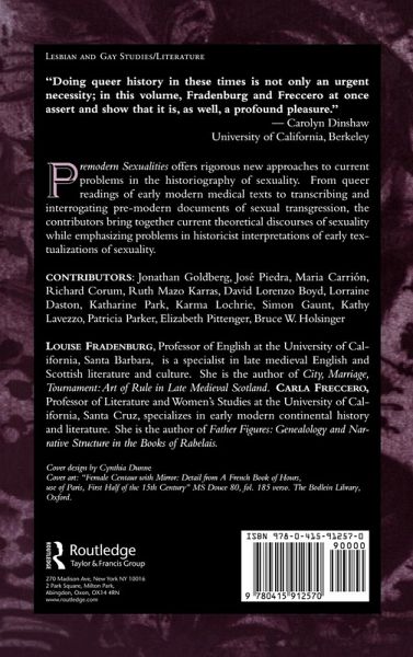 "Premodern Sexualities offers rigorous new approaches to current problems in the historiography of sexuality. From queer readings of early modern medical texts to transcribing and interrogating pre-modern documents of sexual transgression, the contributors bring together current theoretical discourses on sexuality while emphasizing problems in historicist interpretation of early textualizations of sexuality. "Premodern Sexualities clarifies the contributions literary studies can make--through its emphasis on reading strategies--to the historiogrphy of sexuality. Editors Louise Fradenburg and Carla Freccero construct a genealogy for the history of sexuality, sexual practices and sexual identities, by expanding the recent abundance of work in the history of sexuality, most notably popularized by John Boswell's "Same-Sex Unions in Pre-modern Europe. Expanding on a special issue of the GLQ which explored the role of pleasure in the construction of narratives about "premodernity" and "modernity," Fradenburg and Freccero call for a rethinking of the categories of history and sexuality in ways that mutually transform each other in the much needed encounter between historicism and queer theory. "Premodern Sexualities is organized into sections that address some of the most significant concerns in sexuality studies today, with essays by scholars from a wide range of literay and historical disciplines. Jonathan Goldberg, Ruth Karras, Bruce Holsinger and many others contribute essays in "The Erotics of Conquest," "Medicine and the Law," and "Sexuality and Sanctity." Contributors include: David Boyd, Maria Carrion, Richard Corum, Lorraine Daston, Simon Gaunt, Jonathan Goldberg, Bruce Holsinger, Ruth Karras, Kathryn Lavezzo, Karma Lochrie, Katherine Park, Patricia Parker, Jose Piedra, and Elizabeth Pittenger