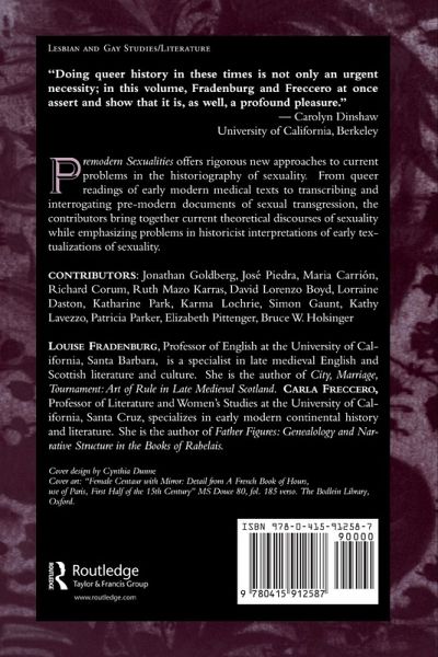 Premodern Sexualities offers rigorous new approaches to current problems in the historiography of sexuality. From queer readings of early modern medical texts to transcribing and interrogating premodern documents of sexual transgression, the contributors bring together current theoretical discourses on sexuality while emphasizing problems in the historicist interpretation of early textualizations of sexuality. Premodern Sexualities clarifies the contributions literary studies can make--through its emphasis on reading strategies--to the historiography of sexuality.