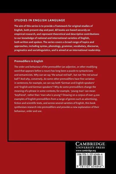 The order and behaviour of the premodifier (an adjective, or other modifying word that appears before a noun) has long been a puzzle to syntacticians and semanticists. Why can we say 'the actual red ball', but not 'the red actual ball'? And why, conversely, do some other premodifiers have free variation in sentences; for example we can say both 'German and English speakers' and 'English and German speakers'? Why do some premodifiers change the meaning of a phrase in some contexts; for example 'young man', can mean 'boyfriend', rather than 'man who is young'? Drawing on a corpus of over 4,000 examples of English premodifiers from a range of genres such as advertising, fiction and scientific texts, and across several varieties of English, this book synthesises research into premodifiers and provides a new explanation of their behaviour, order and use.