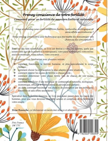 Vous souhaitez une contraception fiable, naturelle, écologique et sans effets secondaires ?Vous voulez connaître une technique qui permette de maximiser vos chances de conception ?Basé sur des faits scientifiques, ce livre est destiné à vous, les femmes, quels que soient votre âge (de la puberté à la ménopause), votre passé contraceptif, votre milieu socio-économique, votre culture, votre croyance...Vous pourrez vous familiariser avec plusieurs notions :- comment fonctionne la fertilité humaine, et plus spécialement le corps féminin ;- comment choisir la contraception la plus adaptée à votre situation ;- comment repérer les signes de fertilité à chaque cycle ;- comment déterminer votre phase fertile lors de chacun de vos cycles menstruels ;- comment bénéficier d'une technique de contraception naturelle, écologique, économique, efficace et fiable (même en période post-partum) ;- ou alors comment maximiser vos chances de conception par des techniques naturelles et sans effets secondaires.Spécialisé dans la fertilité féminine, ce livre peut aussi passer dans les mains des hommes, pour que vous deveniez ensemble acteurs et complices de la fertilité de votre couple.