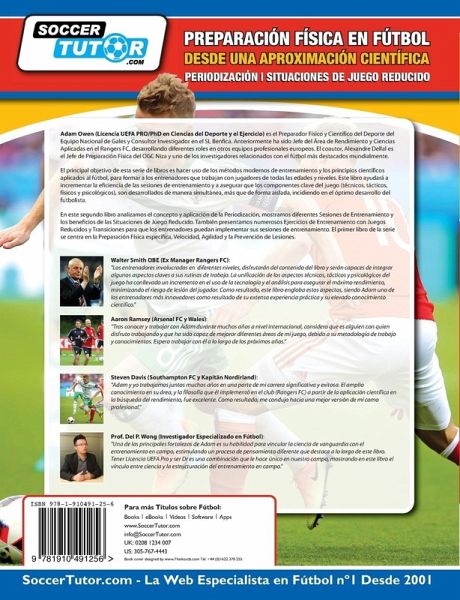 Adam Owen (UEFA PRO / Licencia de doctorado en deportes y ciencias del ejercicio) es el entrenador de deportes físicos y científicos de la Selección Nacional de Gales y consultor de investigación en SL Benfica. Anteriormente, ha sido Jefe del Área de Rendimiento y Ciencias Aplicadas en Rangers FC, desarrollando diferentes roles en otros equipos profesionales europeos. El coautor, Alexandre Dellal, es el Jefe de Preparación Física de la OGC Niza y uno de los investigadores más destacados relacionados con el fútbol en todo el mundo. El objetivo principal de esta serie de libros es hacer uso de métodos modernos de entrenamiento y principios científicos aplicados al fútbol, ¿¿para entrenar a entrenadores que trabajan con jugadores de todas las edades y niveles. Este libro ayudará a aumentar la eficiencia de las sesiones de entrenamiento y asegurará que los componentes clave del juego (técnico, táctico, físico y psicológico) se desarrollen simultáneamente, en lugar de aislarse, afectando el desarrollo óptimo del jugador. En este segundo libro analizamos el concepto y la aplicación de la Periodización, mostramos diferentes Sesiones de Entrenamiento y los beneficios de las Situaciones de Juego Reducido. También presentamos numerosos ejercicios de entrenamiento con juegos y transiciones reducidas para que los entrenadores puedan implementar sus sesiones de entrenamiento. El primer libro de la serie se centra en la preparación física específica, la velocidad, la agilidad y la prevención de lesiones. Gareth Bale Futbolista del Real Madrid C.F. y la Selección Nacional de Gales "Adam es alguien en quien siempre he confiado y de quien valoro su opinión y consejo. Permanecemos en constante comunicación entre los partidos internacionales y tenemos una excelente relación personal y profesional. Haber trabajado tanto tiempo en la élite internacional demuestra su valía profesional. Es un profesional de cuyo trabajo me he beneficiado y con el que disfrutaría trabajando en el día a día." Javier Mascherano Futbolista del Hebei China Fortune (anteriormente FC Barcelona y Argentina) ''Conoci a Adam en China, y desde el primer dia iniciamos una gran relación tanto profesional como personal. Es un gran profesional que transmite una gran pasión por este deporte. Le estoy agradecido por el tiempo que llevamos trabajando juntos, ya que ha sido de gran ayuda en todo este tiempo tanto a nivel profesional como personal. Espero que podamos seguir trabajando juntos mucho tiempo más.''