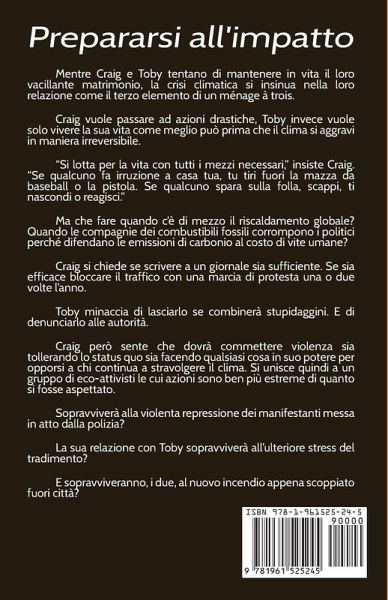 Mentre Craig e Toby tentano di mantenere in vita il loro vacillante matrimonio, la crisi climatica si insinua nella loro relazione come il terzo elemento di un ménage à trois.Craig vuole passare ad azioni drastiche, Toby invece vuole solo vivere la sua vita come meglio può prima che il clima si aggravi in maniera irreversibile."Si lotta per la vita con tutti i mezzi necessari," insiste Craig. "Se qualcuno fa irruzione a casa tua, tu tiri fuori la mazza da baseball o la pistola. Se qualcuno spara sulla folla, scappi, ti nascondi o reagisci."Ma che fare quando c'è di mezzo il riscaldamento globale? Quando le compagnie dei combustibili fossili corrompono i politici perché difendano le emissioni di carbonio al costo di vite umane?Craig si chiede se scrivere a un giornale sia sufficiente. Se sia efficace bloccare il traffico con una marcia di protesta una o due volte l'anno.Toby minaccia di lasciarlo se combinerà stupidaggini. E di denunciarlo alle autorità.Craig però sente che dovrà commettere violenza sia tollerando lo status quo sia facendo qualsiasi cosa in suo potere per opporsi a chi continua a stravolgere il clima. Si unisce quindi a un gruppo di eco-attivisti le cui azioni sono ben più estreme di quanto si fosse aspettato.Sopravviverà alla violenta repressione dei manifestanti messa in atto dalla polizia?La sua relazione con Toby sopravviverà all'ulteriore stress del tradimento?E sopravviveranno, i due, al nuovo incendio appena scoppiato fuori città? Craig wants to take drastic action but Toby just wants to live his life as best he can before climate breakdown escalates. "You fight for your life by any means necessary," Craig insists. "If someone breaks into your house, you pull out a baseball bat or a gun. When there's a mass shooting, you run, hide, or fight back."But when it involves global warming? And fossil fuel industries buying politicians who protect carbon emissions at the cost of human lives?Craig wonders if a letter to the editor is effective. If blocking traffic at a rally once or twice a year is enough.Toby threatens to leave him if does anything stupid. And to report him to the authorities.But Craig feels he'll need to commit violence one way or another, either by condoning the status quo or by doing whatever he can to fight those who keep destabilizing the climate. So he joins a group of eco activists whose efforts are far more extreme than even he had expected.Will Craig survive the violent police crackdown on protesters?Will his relationship with Toby survive the additional stress of betrayal?And will either of them survive the new wildfire that's just started at the edge of town?