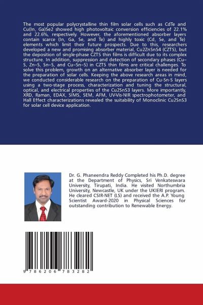 The most popular polycrystalline thin film solar cells such as CdTe and Cu(In, Ga)Se2 showed high photovoltaic conversion efficiencies of 22.1% and 22.6%, respectively. However, the aforementioned absorber layers contain scarce (In, Ga, Se, and Te) and highly toxic (Cd, Se, and Te) elements which limit their future prospects. Due to this, researchers developed a new and promising absorber material, Cu2ZnSnS4 (CZTS), but the deposition of single-phase CZTS thin films is difficult due to its complex structure. In addition, suppression and detection of secondary phases (Cu-S, Zn-S, Sn-S, and Cu-Sn-S) in CZTS thin films are critical challenges. To solve this problem, growth on an alternative absorber layer is needed for the preparation of solar cells. Keeping the above research areas in mind, we conducted considerable research on the preparation of Cu-Sn-S layers using a two-stage process, characterization and tuning the structural, optical, and electrical properties of the Cu2SnS3 layers. More importantly, XRD, Raman, EDAX, SIMS, SEM, AFM, UV-Vis-NIR spectrophotometer, and Hall Effect characterizations revealed the suitability of Monoclinic Cu2SnS3 for solar cell device application.