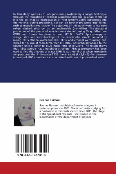 In This study synthesis of inorganic oxide material by a sol-gel technique through the formation of colloidal suspension (sol) and gelation of the sol into the gel enables incorporation of heat-sensitive active substances into the material during processing. Sol can be further processed into forms, such as monoliths(rod shape).The objectives of this study were to evaluate sol-gel derived silica gel as an implantable (monoliths). The structural properties of the prepared samples were studied ,using X-ray diffraction (XRD) and Fourier transform infrared (FTIR), UV-VIS. Spectroscopy of xerogel silica and liner shrinkage of the samples.the sample prepared by mixing TEOS,ethonal,water,and HCL ,TEOS and ethonal were mixing and stirred for 10 min at room temp.then 0.1 MHCL was gradually added to the solution until a water to TEOS molar ratio of R=2,R=5.The results shows that, silica xerogel has amorphous structure ,FTIR spectroscopy has been used to find the amount of water (OH) ,it wasfound that when increase in temperatures the R (R=water:TEOS molar ratio) (R=2,R=5) the decrease intensity of H2O absorbance are consistent with loss of physisorbed water.