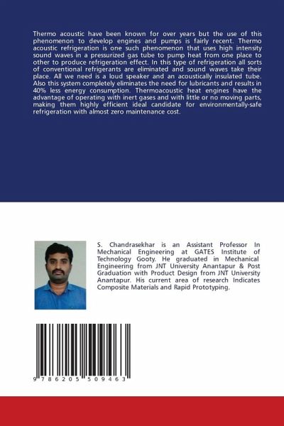 Thermo acoustic have been known for over years but the use of this phenomenon to develop engines and pumps is fairly recent. Thermo acoustic refrigeration is one such phenomenon that uses high intensity sound waves in a pressurized gas tube to pump heat from one place to other to produce refrigeration effect. In this type of refrigeration all sorts of conventional refrigerants are eliminated and sound waves take their place. All we need is a loud speaker and an acoustically insulated tube. Also this system completely eliminates the need for lubricants and results in 40% less energy consumption. Thermoacoustic heat engines have the advantage of operating with inert gases and with little or no moving parts, making them highly efficient ideal candidate for environmentally-safe refrigeration with almost zero maintenance cost.