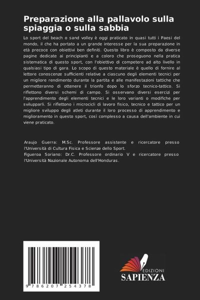 Lo sport del beach o sand volley è oggi praticato in quasi tutti i Paesi del mondo, il che ha portato a un grande interesse per la sua preparazione in età precoce con obiettivi ben definiti. Questo libro è composto da diverse pagine dedicate ai principianti e a coloro che proseguono nella pratica sistematica di questo sport, con l'obiettivo di competere ad alto livello in qualsiasi tipo di gara. Lo scopo di questo materiale è quello di fornire al lettore conoscenze sufficienti relative a ciascuno degli elementi tecnici per un migliore rendimento durante la partita e alle manifestazioni tattiche che permetteranno di ottenere il trionfo dopo lo sforzo tecnico-tattico. Si riflettono diversi schemi di campo. Si osservano diversi esercizi per l'apprendimento degli elementi tecnici e le loro varianti o modifiche per svilupparli. Si riflettono i microcicli di lavoro fisico, tecnico e tattico per un migliore sviluppo degli atleti durante il loro processo di apprendimento e miglioramento in questo sport, così complesso a causa dell'ambiente in cui viene praticato.