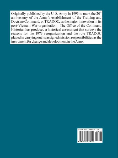Originally published by the U. S. Army in 1993 to mark the 20th anniversary of the Army's establishment of the Training and Doctrine Command, or TRADOC, as the major innovation in its post-Vietnam War organization. The Office of the Command Historian has produced a historical assessment that surveys the reasons for the 1973 reorganization and the role TRADOC played in carrying out its assigned mission responsibilities as the instrument for change and development in the Army.