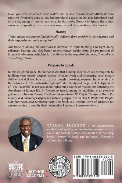 Have you ever wondered what makes one person fundamentally different from another? If you have done so, you have pondered a question that may have dated back to the beginning of human existence. In this book, Prepare to Speak, the author answers that question. Its answer is among many of his quotations, which reads: Hearing "What makes one person fundamentally different from another is their hearing and their responsiveness to its reception." Additionally, among his assertions is devotion to right thinking and right doing enhances hearing and that better responsiveness results from the progression of human development, which he further details in the sequel to this book, Humanity: A Three-Story House. Prepare to Speak In this insightful guide, the author shares that Finding Your Voice is a prerequisite to fulfilling your heart's deepest desires by identifying and leveraging your unique abilities and skill sets. In a particularly thought-provoking segment, he contends that the endowment of the inalienable rights of "Life, Liberty, and the pursuit of Happiness" of "The Preamble" is not just about rights but a source of wisdom for obtaining the abundance of human life. In Prepare to Speak, among its highlights is its practical guidance on How to Harness The Power of Speech and Writing to Transform Your Life, Liberty, and Pursuit of Happiness, and fresh perspectives on How to Work With People, Stay Motivated, and Overcome Fear. This book is a treasure trove of guidance for anyone looking to amplify their potential and embrace human excellence.