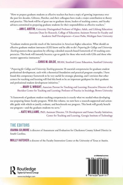 Introduction -Joanna Gilmore and Molly Hatcher 1. Overview of the Graduate and Professional Student Teaching Competencies Framework -Joanna Gilmore 2. Acquiring Disciplinary Knowledge -Michelle A. Maher and Michael T. Ashby 3. Developing Professional Identity and Dispositions -Alan Kalish and Jennifer S. Collins 4. Discovering the Possibilities. Exploring Disciplinary and Institutional Contexts for Teaching -Tershia Pinder-Grover and Audra Baleisis 5. Incorporating Professional Standards and Ethics Instruction Into Graduate Student Instruction and Future Faculty Preparation -Molly Hatcher and Linda M. von Hoene 6. Using Knowledge About How People Learn to Inform Teaching -Joanna Gilmore 7. Setting and Communicating Learning Goals and Expectations -Alan Kalish and Michael K. Murphy 8. Teaching With Attention to Diversity and Inclusion -Lauren Miller Griffith 9. Assessing Student Work to Promote Learning -Ashley Leyba and Linda M. von Hoene 10. Teaching Graduate Students to Use Discipline-Specific, Evidence-Based Practices. Terms, Practices, and Opportunities -Katherine Kearns 11. Lenses and Recommendations for Helping Graduate Students Assess and Improve Teaching in Community -Steven Hansen and Erin M. Rentschler 12. Applying the Holistic Competencies Framework - Molly Hatcher Editors and Contributors Index