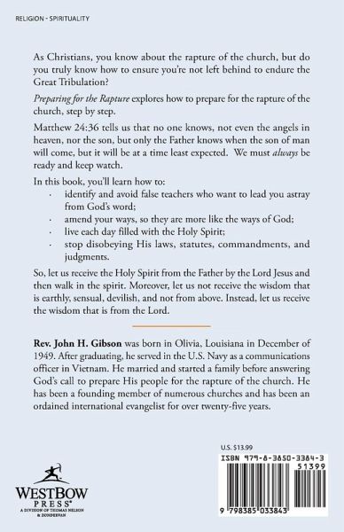 As Christians, you know about the rapture of the church, but do you truly know how to ensure you're not left behind to endure the Great Tribulation? Preparing for the Rapture explores how to prepare for the rapture of the church, step by step. Matthew 24:36 tells us that no one knows, not even the angels in heaven, nor the son, but only the Father knows when the son of man will come, but it will be at a time least expected. We must always be ready and keep watch. In this book, you'll learn how to: identify and avoid false teachers who want to lead you astray from God's word; amend your ways, so they are more like the ways of God; live each day filled with the Holy Spirit; stop disobeying His laws, statutes, commandments, and judgments. So, let us receive the Holy Spirit from the Father by the Lord Jesus and then walk in the spirit. Moreover, let us not receive the wisdom that is earthly, sensual, devilish, and not from above. Instead, let us receive the wisdom that is from the Lord.