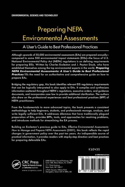 Charles H. Eccleston is listed in Marquis' Who's Who in the World and Who's Who in America as a nationally recognized NEPA authority. He is a consultant, author, and lecturer with some 30 years experience in NEPA, environmental policy, and analyzing the impacts of projects and energy-related policies. He also frequently consults on NEPA lawsuits. He is the author of nine books and 80 professional publications. Some of his recent books include: * Environmental Impact Assessment: A Guide to Best Professional Practices * Inside Energy: Developing and Managing an ISO 50001 Energy Management System * Global Environmental Policy: Concepts, Principles, and Practice * NEPA and Environmental Planning: Tools, Techniques, and Approaches for Practitioners J. Peyton Doub, CEP, PWS, is an Environmental Scientist and expert in preparing EAs. He has more than 20 years experience preparing EAs and EISs, wetlands and natural resources investigations, and other environmental reports. He is the author of The Endangered Species Act: History, Implementation, Successes, and Controversies (CRC Press, 2012).