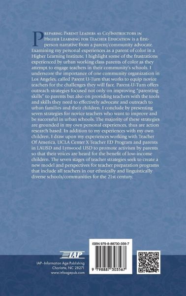 This book is a first person narrative from a parent/community advocate. Examining my personal experiences as a parent of color in a Higher Learning Institute, I highlight some of the frustrations experienced by urban working class parents of color as they attempt to engage teachers in their community's schools. I underscore the importance of one community organization in Los Angeles, called Parent U-Turn that works to equip novice teachers for the challenges they will face. Parent-U-Turn offers outreach strategies focused not only on improving "parenting skills" to parents but also on providing teachers with the tools and skills they need to effectively advocate and outreach to urban families and their children. I conclude by presenting seven strategies for novice teachers who want to improve and be successful in urban schools. The majority of these strategies are grounded in my own personal experiences, thus are action research based. In addition to my experiences with my own children, I draw upon my experiences working with Teacher Of America, UCLA Center X Teacher ED Program and parents in LAUSD and Lynwood USD to promote activism by parents so that their voices are heard for the benefit of low-income children. The seven stages of teacher strategies seek to create a new model and perspectives for teacher preparation programs that include all teachers in our ethnically and linguistically diverse schools/communities for the 21st Century.