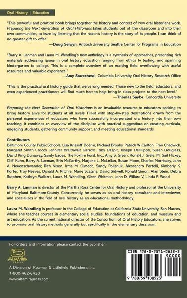 Preparing the Next Generation of Oral Historians is an invaluable resource to educators seeking to bring history alive for students at all levels. The anthology opens with chapters on the fundamentals of oral history and its place in the classroom, but its heart lies in nearly two dozen insightful personal essays by educators who have successfully incorporated oral history into their own teaching. Filled with step by step descriptions and positive student feedback, these chapters offers practical suggestions on creating curricula, engaging students, gathering community support, and meeting educational standards. Lanman and Wendling open each chapter with thoughtful questions that guide readers, whether unfamiliar with oral history or seeking to refine their approach, in applying the examples to their own classrooms. The bibliography of further resources at the anthology's close provides interested educators with all the information necessary to transform their lessons and show their students' history's power as a living force within their own lives and communities.