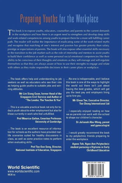 This book is to expose youths, educators, counsellors and parents to the current demands in the workplace and how there is an urgent need to strengthen and develop deep skills and work-related competencies among youths to prepare them for a more self-fulfilling career path. The reader will realise the importance of eradicating some of the work-related myths and recognise that matching of one's interest and passion has greater priority than salary, prestige or expectations of parents. The book will also expose other essential skills necessary in the transition to the job market such as the role of internship and mentors to assist youths to build their confidence as well as some personal social emotional competencies like their ability to be conscious of their thoughts and emotions as they self-manage and self-regulate themselves so that they are always aware of how to use their strengths to engage and relate with others as they make responsible decisions in their career plans or workplace.