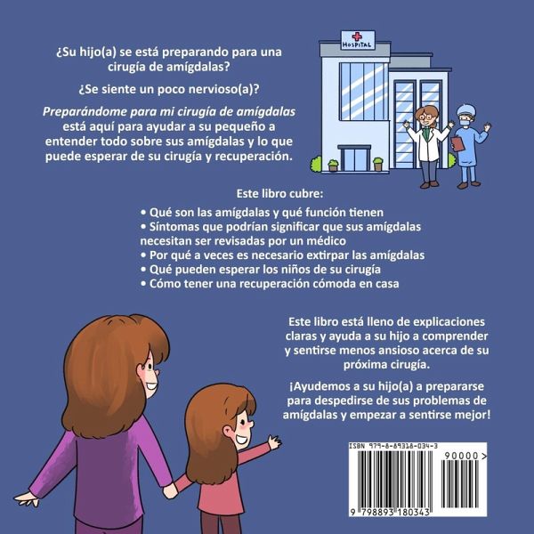 ¿Su hijo(a) se está preparando para una cirugía de amígdalas? ¿Se siente un poco nervioso(a)? Preparándome para Mi Cirugía de Amígdalas está aquí para ayudar a su pequeño a entender todo sobre sus amígdalas y lo que puede esperar de su cirugía y recuperación. Este libro cubre: * Qué son las amígdalas y qué función tienen * Síntomas que podrían significar que sus amígdalas necesitan ser revisadas por un médico * Por qué a veces es necesario extirpar las amígdalas * Qué pueden esperar los niños de su cirugía * Cómo tener una recuperación cómoda en casa Este libro está lleno de explicaciones claras y ayuda a su hijo a comprender y sentirse menos ansioso acerca de su próxima cirugía. ¡Ayudemos a su hijo a prepararse para despedirse de sus problemas de amígdalas y empezar a sentirse mejor! ¡Obtenga su copia hoy!