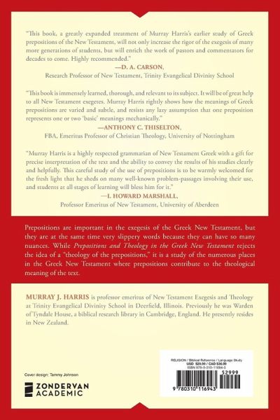 Prepositions are important in the exegesis of the Greek New Testament, but they are at the same time very slippery words because they can have so many nuances. While Prepositions and Theology in the Greek New Testament rejects the idea of a "theology of the prepositions," it is a study of the numerous places in the Greek New Testament where prepositions contribute to the theological meaning of the text. Offered in the hope that it might encourage close study of the Greek text of the New Testament, its many features include the following: Coverage of all 17 "proper" and 42 "improper" prepositions Explores both literary and broader theological contexts Greek font--not transliteration--used throughout Comprehensive indexes to hundreds of verses, subjects, and Greek words Discussion of key repeated phrases that use a particular preposition