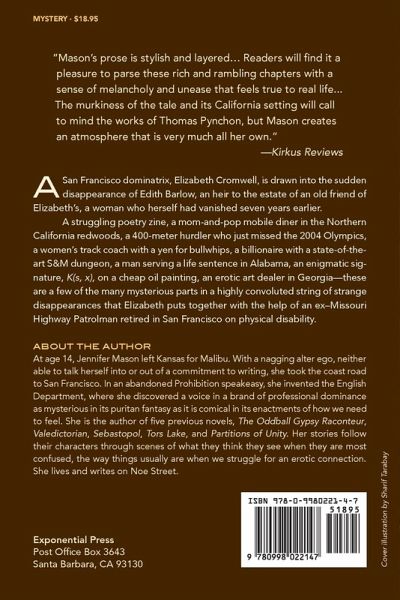 At age 14, Jennifer Mason left Kansas for Malibu. With a nagging alter ego, neither able to talk herself into or out of a commitment to writing, she took the coast road to San Francisco. In an abandoned Prohibition speakeasy, she invented the English Department, where she discovered a voice in a brand of professional dominance as mysterious in its puritan fantasy as it is comical in its enactments of how we need to feel. She is the author of five previous novels, The Oddball Gypsy Raconteur, Valedictorian, Sebastopol, Tors Lake, and Partitions of Unity. Her stories follow their characters through scenes of what they think they see when they are most confused, the way things usually are when we struggle for an erotic connection. She lives and writes on Noe Street.
