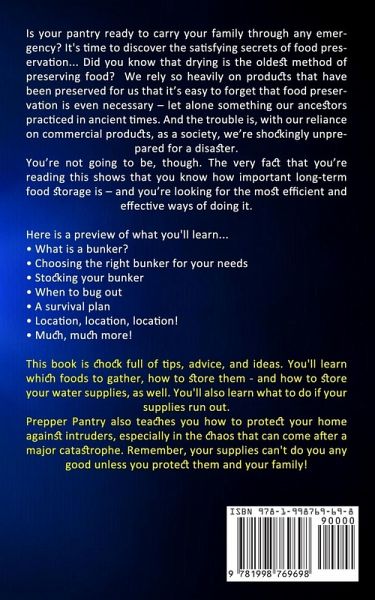 Is your pantry ready to carry your family through any emergency? It's time to discover the satisfying secrets of food preservation... Did you know that drying is the oldest method of preserving food? We rely so heavily on products that have been preserved for us that it's easy to forget that food preservation is even necessary - let alone something our ancestors practiced in ancient times. And the trouble is, with our reliance on commercial products, as a society, we're shockingly unprepared for a disaster. You're not going to be, though. The very fact that you're reading this shows that you know how important long-term food storage is - and you're looking for the most efficient and effective ways of doing it. Here is a preview of what you'll learn...What is a bunker? Choosing the right bunker for your needs Stocking your bunker When to bug out A survival plan Location, location, location! Much, much more! This book is chock full of tips, advice, and ideas. You'll learn which foods to gather, how to store them - and how to store your water supplies, as well. You'll also learn what to do if your supplies run out. Prepper Pantry also teaches you how to protect your home against intruders, especially in the chaos that can come after a major catastrophe. Remember, your supplies can't do you any good unless you protect them and your family!