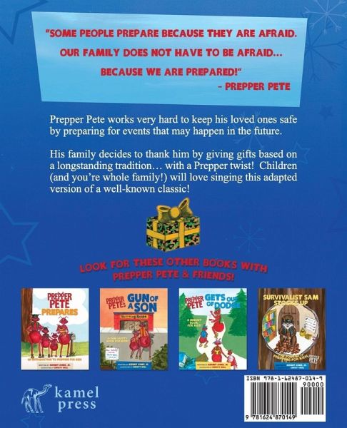 Another original Prepper book for kids! Prepper Pete works very hard to keep his loved ones safe by preparing for events that may happen in the future. His family decides to thank him by giving gifts based on a longstanding tradition... with a Prepper twist! Children (and you're whole family!) will love singing this adapted version of a well-known classic! ***** "Some people prepare because they are afraid. Our family does not have to be afraid... because we are prepared!" -Prepper Pete ***** A note for grownups! Teaching kids the importance of being prepared doesn't have to be harsh or scary. Regardless of why you (or someone you may know) prepare, remember that the single most important thing you can teach your kids is how to think! All the preps in the world don't mean a thing if people don't know how to think clearly. Teach useful skills to all of the kids you know, to include critical thinking, problem solving, and the most important one of all - how to be resourceful! Prepper Pete and Friends are the first and only Prepper books on the market designed especially for kids! Check back often for new releases! Keep preppin'!1