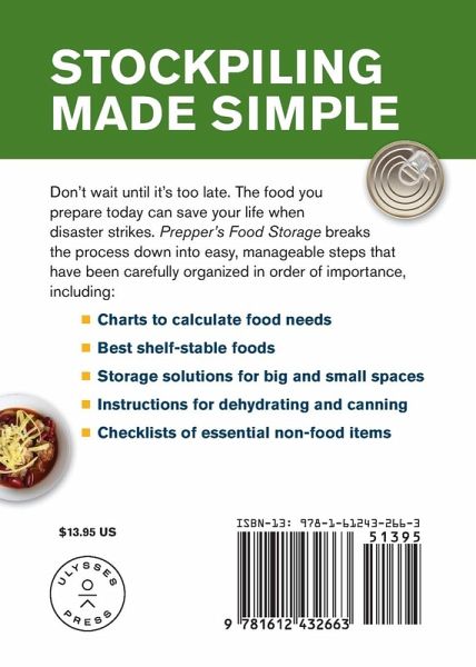 Learn how easy it is to plan for and put together a life-saving supply of nutritious, long-lasting food to protect yourself and your entire family in preparation for any potential disaster Don't wait until it's too late. The food you prepare today can save your life when disaster strikes. Prepper's Food Storage breaks the process down into easy, manageable steps that have been carefully organized in order of importance, including: - Charts to calculate food needs - Best shelf-stable foods - Storage solutions for big and small spaces - Instructions for dehydrating and canning - Checklists of essential non-food items